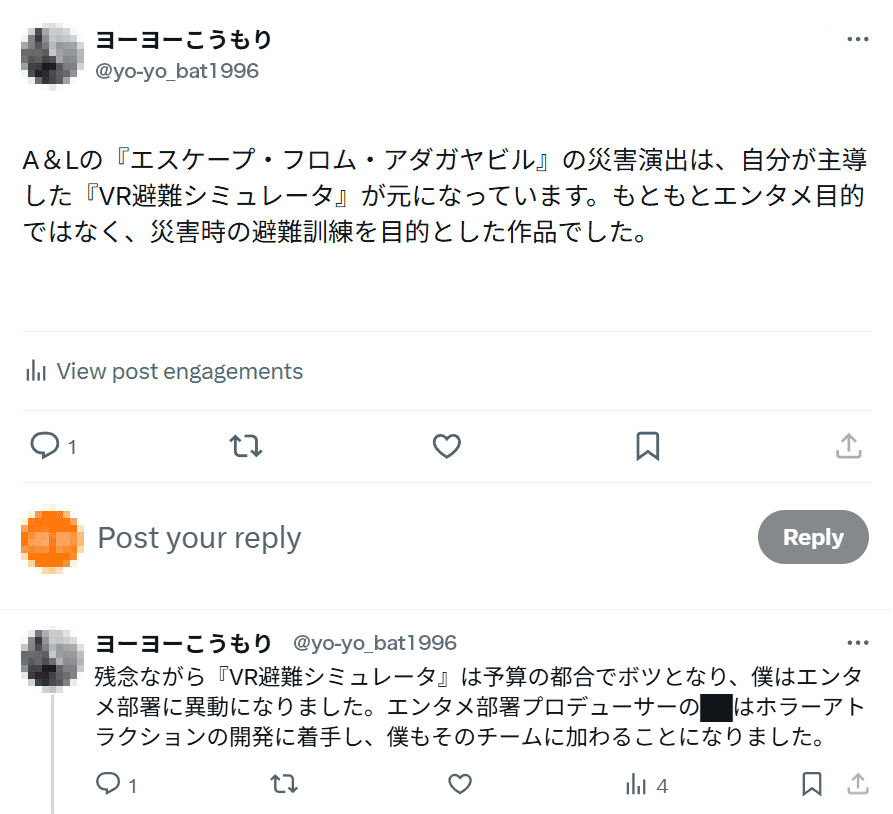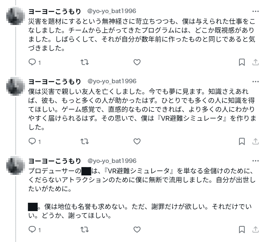 Bは、『VR避難シミュレータ』は自身の被災体験を基にしたプロジェクトであり、実用的なコンテンツとして制作されたものである。本来の意図とは異なる商業的なホラーコンテンツに無断で流用することは、自身の名誉を毀損するものである、と主張。█月現在、係争中(注8)である。