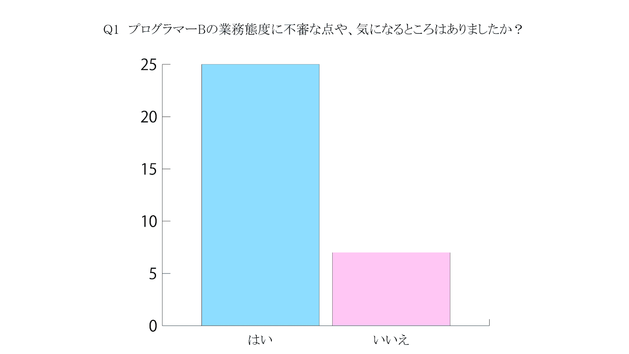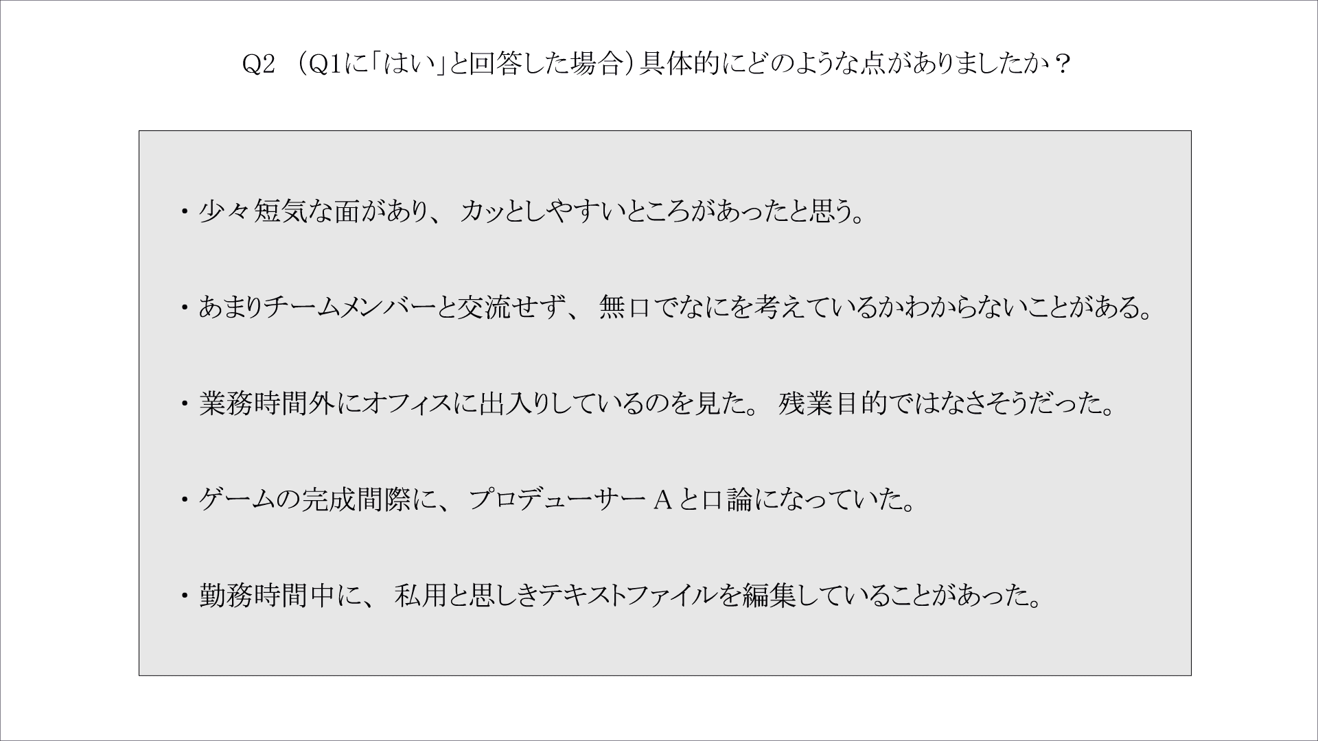 これらのアンケート結果から、プログラマーBの業務態度、ならびにその性格や人格に問題があったことは明白である。